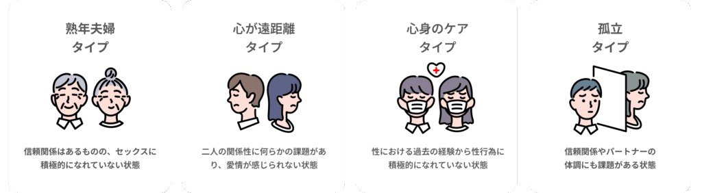 セックスレスタイプ診断は、パートナーとの性行為の頻度や関係性、感情面の距離感などをもとに、レスの原因タイプを分類するツールです。タイプを知ることで、改善に向けた第一歩が踏み出しやすくなります。