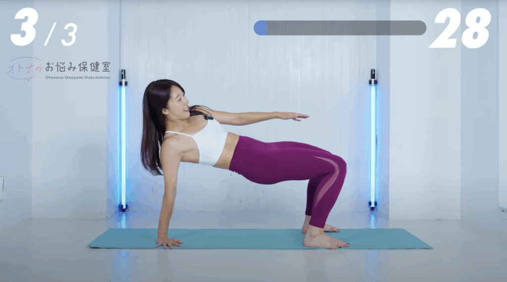 竹内有紀さんが紹介する上級編は、従来の「基本の動き」に加えて全身の筋肉をフル活用するトレーニング。ブリッジのような姿勢や四つん這いの体勢を取り入れ、日常生活ではあまり使わない筋肉にアプローチします。